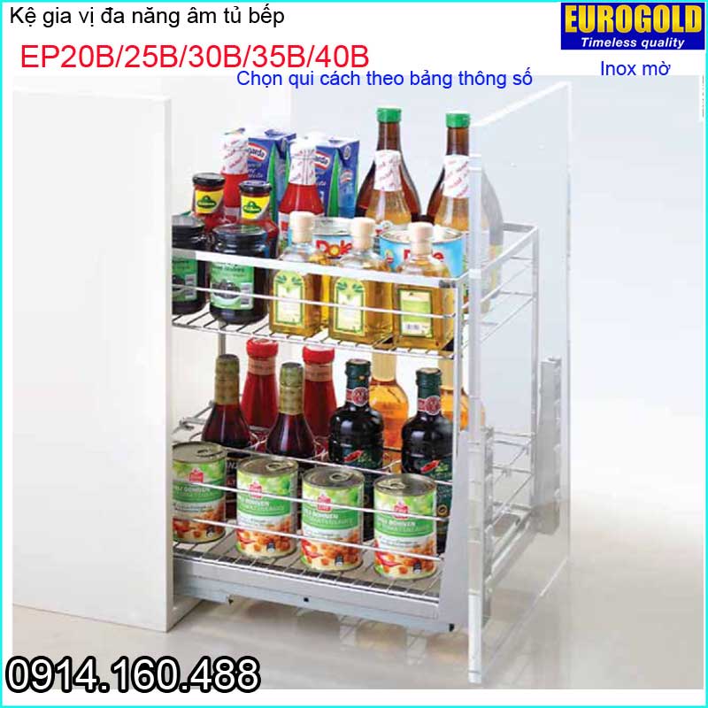 Kệ gia vị đa năng âm tủ bếp EUROGOLD-EPB bằng inox Nhật Bản không gỉ sét,hiện đại,sang trọng ,tiện nghi cho gia đình,có nhiều qui cách,đa dạng kiểu dáng tại KIẾN AN GIA-0914.160.488.Trọn bộ Phụ kiện tủ bếp cho cuộc sống tiện nghi thời @.Phụ kiện tủ bếp sản xuất theo tiêu chuẩn châu Âu nên có kích thước CHUẨN .Bạn cần tham khảo kỹ thông số,thợ tủ bếp phải gia cố hoặc điều chỉnh chiều rộng tủ bếp để lắp vừa sản phẩm.Liên hệ phòng kinh doanh 0914.160.488 để có giá tốt nhất